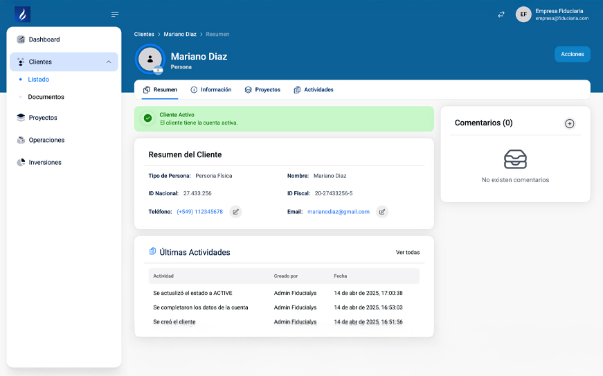 Gestión centralizada de clientes con registro de sus operaciones e inversiones.